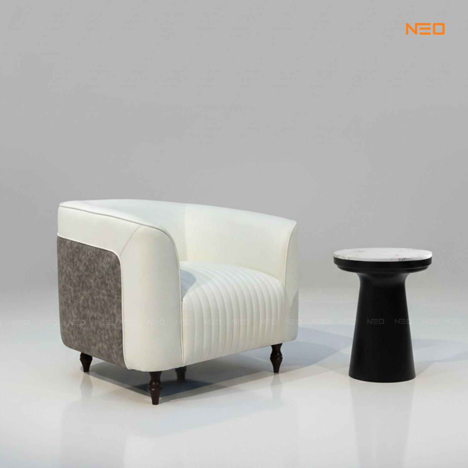 Khám phá Clarics Armchair từ NEO Furniture. Thiết kế bo tròn sang trọng, phối chất liệu vân đá đẳng cấp, khung sườn chuẩn CARB P2 an toàn. Mua ngay để nâng tầm phòng khách!