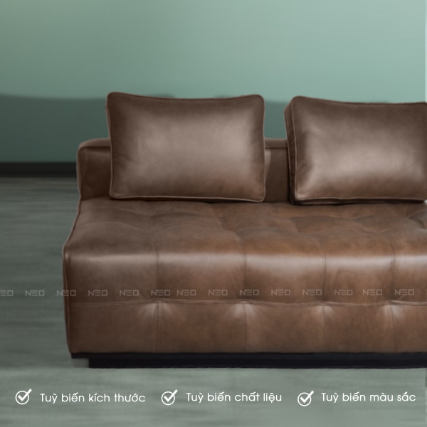 Khung sofa được làm từ gỗ cao cấp đã qua xử lý, đảm bảo chống cong vênh, co ngót và mối mọt. Chân sofa được thiết kế đóng nút cách đất, tạo cảm giác thanh thoát nhưng vẫn giữ được sự chắc chắn. Kích thước tổng thể W2000 x D950 x H800 mang lại tỷ lệ cân đối, phù hợp với nhiều diện tích không gian khác nhau.