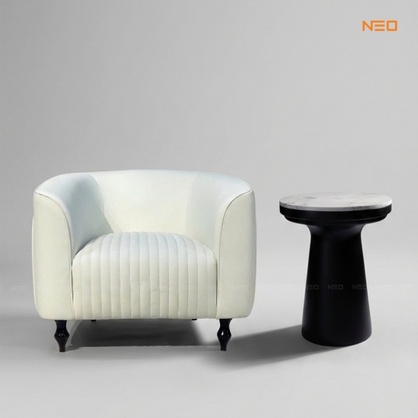 Khám phá Clarics Armchair từ NEO Furniture. Thiết kế bo tròn sang trọng, phối chất liệu vân đá đẳng cấp, khung sườn chuẩn CARB P2 an toàn. Mua ngay để nâng tầm phòng khách!