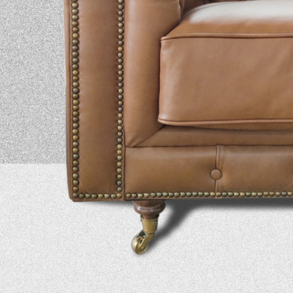 Chân sofa được làm bằng gỗ sồi kết hợp bánh xe kim loại, tạo nên nét đặc trưng vừa cổ điển vừa tiện dụng, giúp di chuyển dễ dàng mà vẫn giữ được vẻ sang trọng.